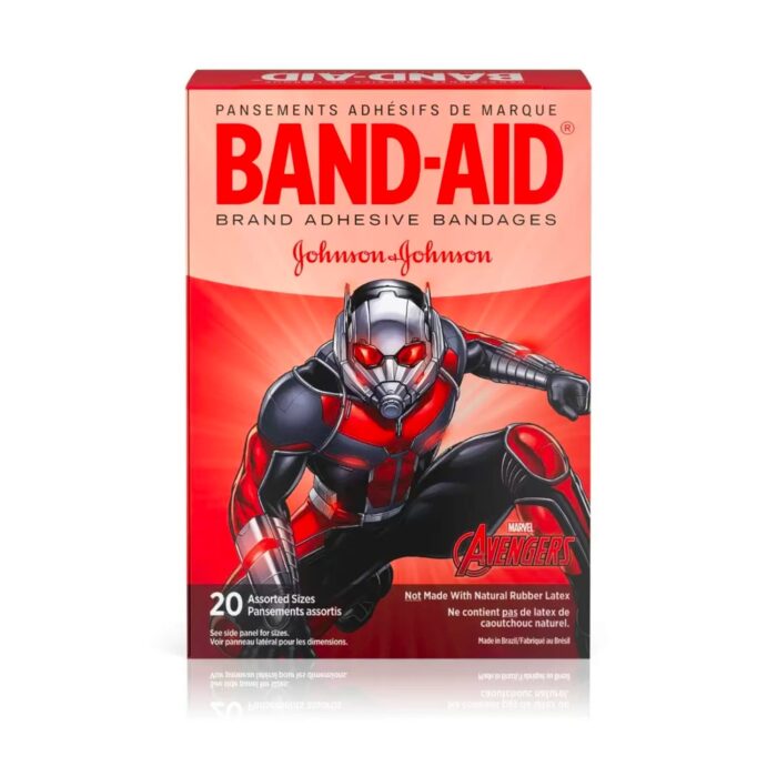 Band-Aid Adhesive Bandages, featuring MARVEL Avengers designs, cover and protect minor cuts and scrapes with fun MARVEL Avengers graphics. This package contains 20 sterile bandages in assorted sizes suitable for small wounds.