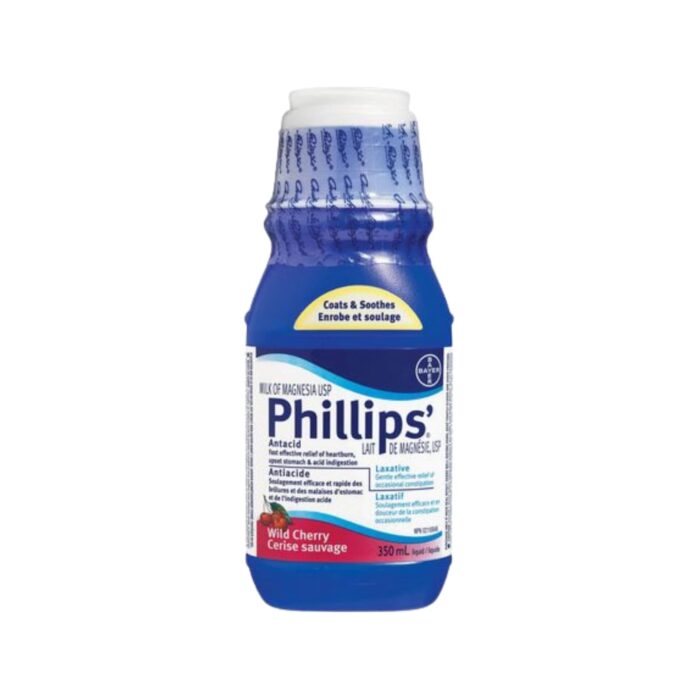 Phillips’ Milk of Magnesia Liquid Cherry Flavour 350mL liquid formula is both an antacid and laxative. As an antacid Phillips’ Milk of Magnesia allows for fast relief of upset stomach, heart burn, and acid indigestion. As a laxative Phillips’ provides gentle and effective relief of occasional constipation.